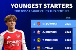 1-道曼(阿森納)2025年,15歲零9個(gè)月