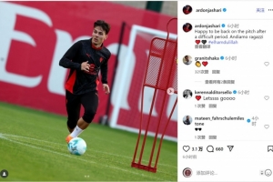亞沙里社媒曬出訓(xùn)練照片,并寫道:“很高興在度過一段艱難時(shí)期之后重返球場(chǎng),加油兄弟們!”