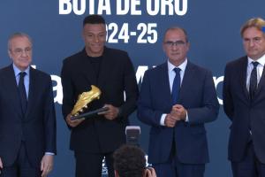 體育資訊10月31日訊 姆巴佩在伯納烏球場貴賓室領取上賽季的歐洲金靴獎杯。這是姆巴佩生涯首次斬獲歐洲金靴,也是烏戈-桑切斯和C羅之后的皇馬第三人。