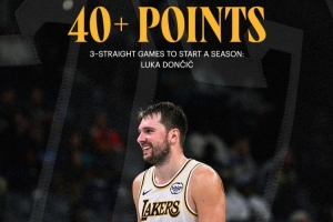體育資訊11月2日訊 湖人官方曬出東契奇40+得分海報(bào),并配文寫道:“開(kāi)季連續(xù)3場(chǎng)拿下40+分的球員:盧卡-東契奇、威爾特-張伯倫?!?/p>