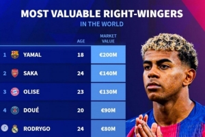 體育資訊11月3日訊 德轉(zhuǎn)列當(dāng)前世界足壇右邊鋒身價(jià)排行,亞馬爾2億歐居首,薩卡1.4億歐第二,奧利塞1.3億歐第三。