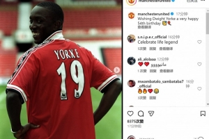 曼聯(lián)官方社媒曬出約克身穿本隊球衣的照片,配文:“祝德懷特-約克54歲生日快樂?!?/p>