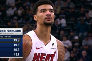 轉(zhuǎn)播方給出數(shù)據(jù):今日比賽之前,熱火本賽季替補(bǔ)場(chǎng)均共得49.8分,聯(lián)盟第一。