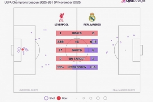 利物浦在本場比賽中將皇馬的預(yù)期進(jìn)球(xG)限制在僅0.45,幾乎沒有給對手機會。