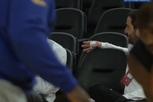 有人拍到庫明加的經(jīng)紀(jì)人與勇士總經(jīng)理鄧?yán)S在場邊聊天,而庫明加在鏡頭近景訓(xùn)練。