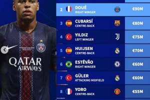 體育資訊11月5日訊 杜埃榮膺2025年金童獎,德轉(zhuǎn)也盤點了足壇U20球員身價榜,具體如下: