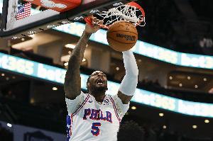 76人內(nèi)線德拉蒙德上半場替補出戰(zhàn)表現(xiàn)出色,不僅是前場籃板搶得很兇,籃下終結也很高效。
