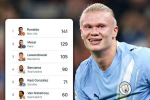 25歲哈蘭德52場歐冠轟入54球,目前排在歐冠歷史射手榜第10。距離第9的穆勒差3球。