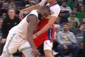 相關(guān)新聞>>>又一個(gè)受害者??杰倫·布朗撞到K·喬治 發(fā)際線粉全粘白T恤上了