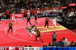 GIF-奎克利掛著亞歷山大·沃克手臂扔進(jìn)三分,可惜不算,給提前犯規(guī)