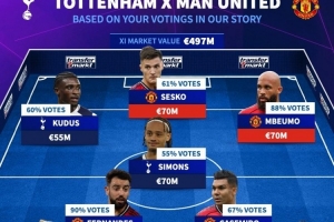 體育資訊11月8日訊 北京時(shí)間今天晚上20點(diǎn)30分,熱刺將在英超第11輪比賽中主場(chǎng)對(duì)陣曼聯(lián)。德國(guó)轉(zhuǎn)會(huì)市場(chǎng)根據(jù)關(guān)注者的投票列出熱刺+曼聯(lián)陣容,B費(fèi)、舍什科、西蒙斯、范德芬在列。