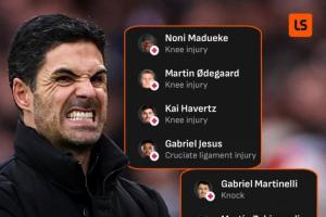目前,哈弗茨、馬杜埃凱、馬丁內(nèi)利、約克雷斯仍處于傷病未愈的狀態(tài),熱蘇斯剛剛回歸訓(xùn)練,槍手一線隊(duì)前鋒僅特羅薩德和薩卡兩人健康能夠上場,中場梅里諾還客串出任首發(fā)中鋒。