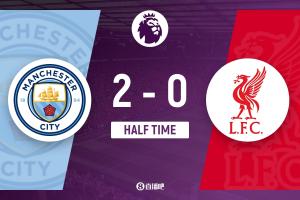 上半場(chǎng)補(bǔ)時(shí)7分鐘,曼城2-0利物浦。