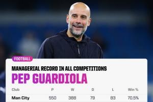執(zhí)教生涯1000場比賽,瓜迪奧拉取得了716勝156平128負(fù)的戰(zhàn)績,勝率超過7成。