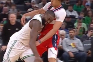 發(fā)際線粉事件之一:對陣奇才時杰倫·布朗發(fā)際線粉粘到對手白T上