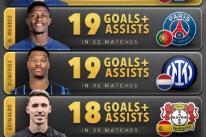 2025年五大聯(lián)賽后衛(wèi)參與進(jìn)球榜: