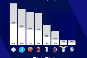 外媒預(yù)測(cè)意甲球隊(duì)闖進(jìn)前五概率:國米99% 那不勒斯90% 羅馬84%
