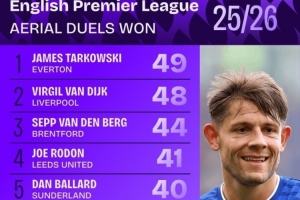 本賽季英超空中成功對抗榜: