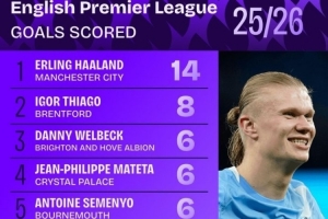 本賽季英超進(jìn)球榜:哈蘭德14球居首,維爾貝克、姆伯莫在列