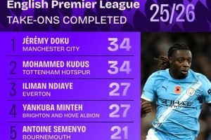 本賽季英超成功過(guò)人榜:多庫(kù)、庫(kù)杜斯并列居首,內(nèi)托、薩卡在列