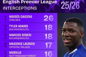 本賽季英超攔截榜:凱塞多獨自領(lǐng)跑,拉克魯瓦、詹姆斯在列