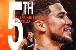 這是布克太陽生涯的第684場比賽,超越凱文·約翰遜獨(dú)居隊(duì)史第五位,排在他前面的是迪克·范-阿斯代爾。