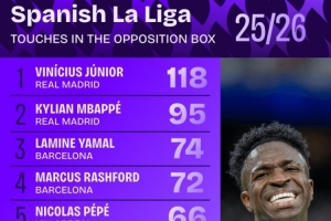 體育資訊11月12日訊 本賽季西甲進行了12輪比賽,Squawka統(tǒng)計了在對方禁區(qū)內觸球次數榜,維尼修斯118次居首,姆巴佩、亞馬爾二三位。