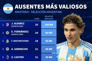 體育資訊11月12日訊 德國轉(zhuǎn)會市場統(tǒng)計(jì)了缺席本期阿根廷隊(duì)球員的身價(jià),并列出榜單,阿爾瓦雷斯1億歐居首,恩佐-費(fèi)爾南德斯8000萬歐次席。