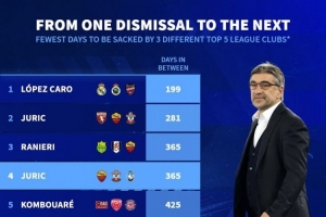 本世紀(jì)五大聯(lián)賽教練最短時間被三家俱樂部解雇排名: