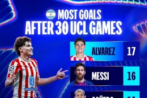 體育資訊11月12日訊 歐冠官方統(tǒng)計(jì)了阿根廷球員前30場歐冠比賽的進(jìn)球數(shù)量,并列出榜單,阿爾瓦雷斯17球居首,梅西16球次席。