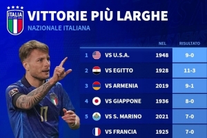 體育資訊11月14日訊 北京時間11月17日凌晨,意大利將在世預(yù)賽最后一輪比賽中主場對陣挪威,意大利此役需要至少凈勝挪威9球,才能直接出線。德國轉(zhuǎn)會市場列出了意大利隊史最大比分勝利榜單。