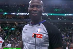 “我們都沒看到是誰出界,判罰結果是隨便來兩個人(any two)中圈跳球。雄鹿對這球提出了挑戰(zhàn)?!?/p>