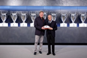今天,皇馬主席弗洛倫蒂諾與NFL總裁羅杰·古德爾會面并互贈禮物,弗洛倫蒂諾獲贈橄欖球,古德爾獲贈皇馬1號球衣以及伯納烏模型。