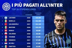 體育資訊11月18日訊 德國轉(zhuǎn)會市場統(tǒng)計(jì)了國米球員的稅前年薪,并列出榜單,勞塔羅1660萬歐居首,巴雷拉、恰爾汗奧盧二三位。