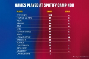 在當(dāng)前陣容中,五位隊長中的四位占據(jù)了隊內(nèi)諾坎普球場出場次數(shù)榜的前列:特爾施特根、弗蘭基·德容、佩德里和阿勞霍。
