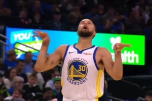 GIF-庫里投中三分后扮鬼臉嘲諷薩格斯