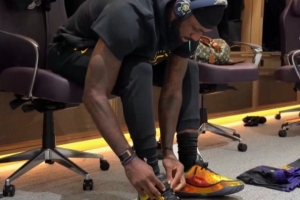 賽前,詹姆斯在更衣室哼著小曲,同時(shí)穿上了他最新一代簽名鞋“詹23”。這將是詹姆斯首次在正式比賽中穿這雙鞋(4萬(wàn)分紀(jì)念款配色)。