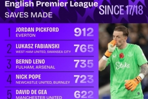 17-18賽季至今英超門將撲救榜:皮克福德912次居首 法比安斯基第二