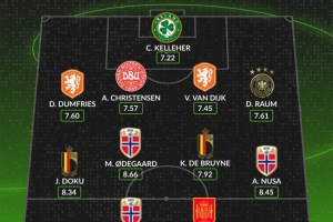 中場:多庫(比利時,8.34分)、厄德高(挪威,8.66分)、德布勞內(nèi)(比利時,7.92分)、安東尼奧·努薩(挪威,8.45分)
