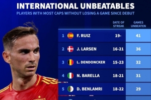 本世紀(jì)球員國(guó)家隊(duì)生涯開局連續(xù)不敗場(chǎng)次紀(jì)錄: