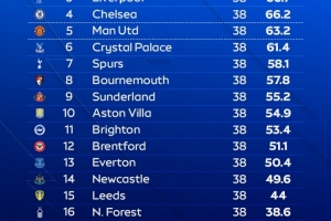 天空體育預(yù)測(cè)本賽季英超最終排名(積分為模擬10萬(wàn)次的平均值)