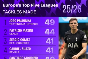體育資訊11月21日訊 Squawka統(tǒng)計(jì)了本賽季球員在五大聯(lián)賽成功搶斷的次數(shù),并列出榜單,帕利尼亞49次居首。