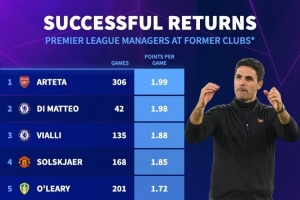 體育資訊11月21日訊 德國轉會市場統(tǒng)計了教練執(zhí)教球員時代英超老東家的場均積分,并列出榜單,阿爾特塔1.99分居首,迪馬特奧1.98分次席。
