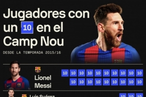 體育資訊11月22日訊 巴薩即將重返諾坎普,Sofascore統(tǒng)計(jì)了2015-2016賽季以來球員在諾坎普球場(chǎng)比賽中獲評(píng)10分的場(chǎng)次,并列出榜單,梅西19場(chǎng)居首。