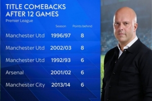 據(jù)天空體育統(tǒng)計(jì),第12輪落后榜首6分或更多最終奪冠,英超歷史只出現(xiàn)過(guò)5次這樣的情況。