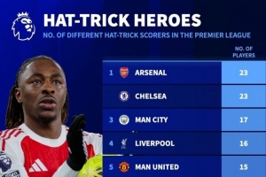 英超戴帽球員數(shù)量排名(球員多次戴帽只算一人):